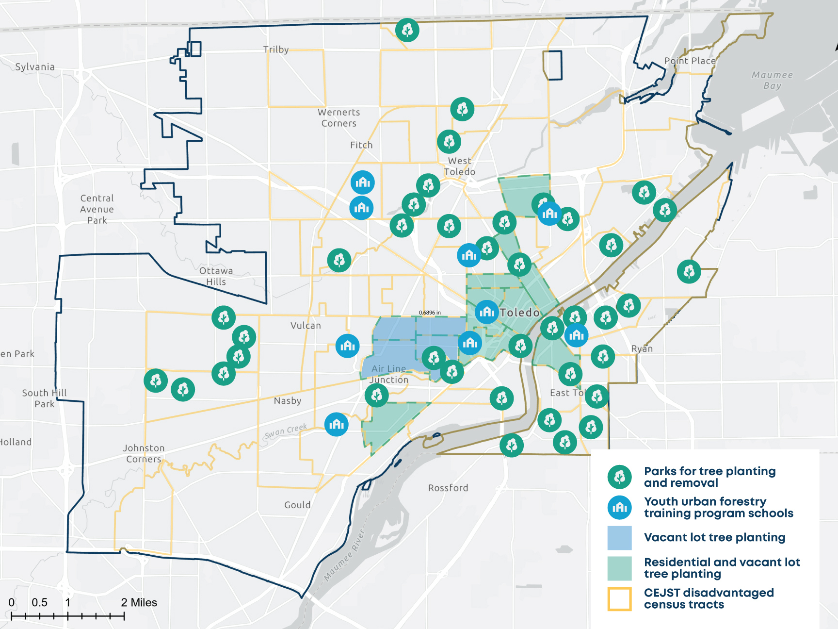 The primary goal of RE-TREE Toledo is to restore, expand, and protect urban trees and forests, with a particular focus on addressing the tree equity gap in Toledo's disadvantaged communities. Toledo’s 10 lowest-canopy census tracts are all in disadvantaged communities. All of the project's benefits will be directed towards these disadvantaged communities, ultimately benefiting over 83,000 residents across 36 census tracts.