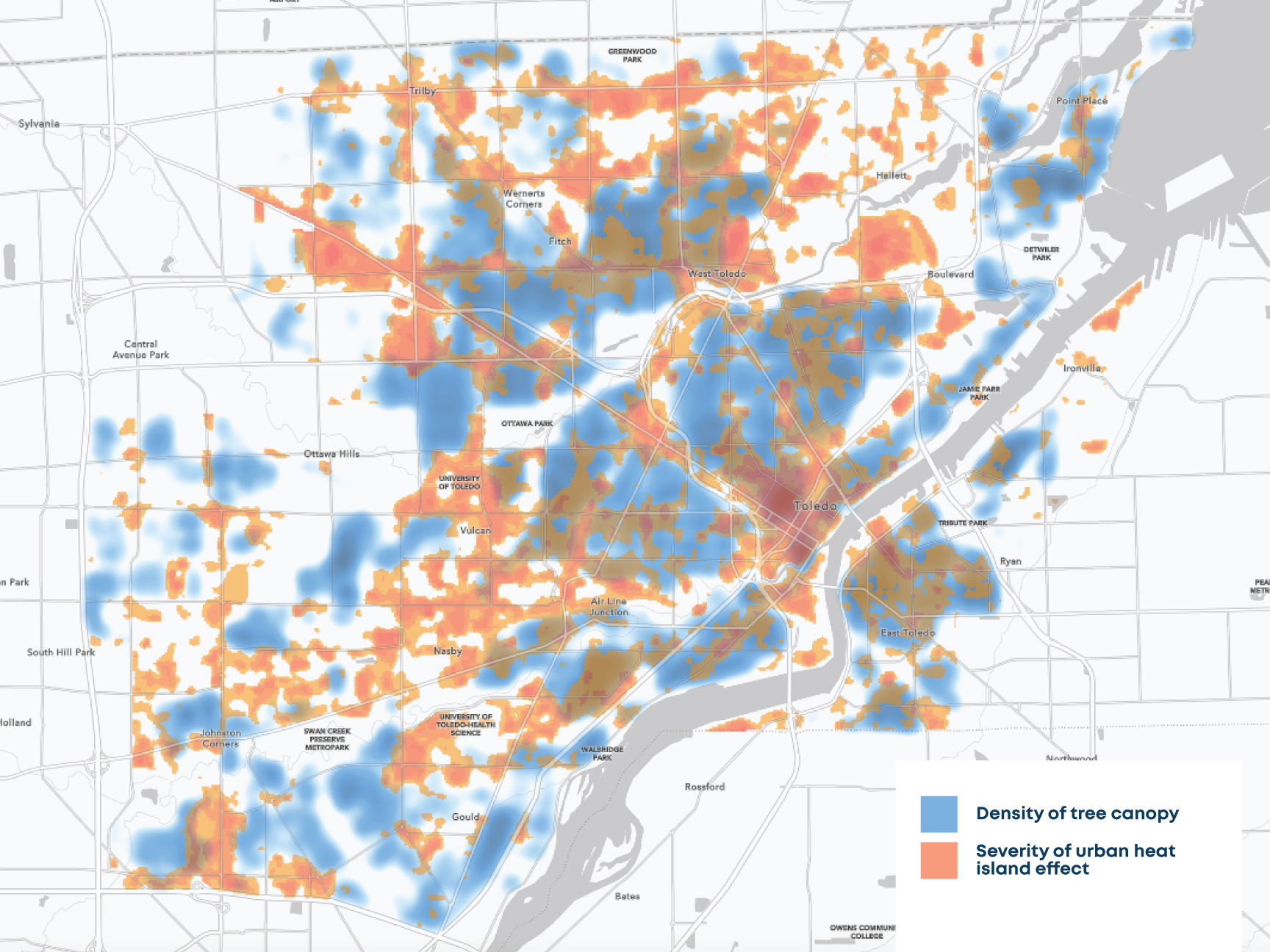 Toledo faces a citywide challenge of low tree canopy, with an average of only 17% coverage, far below the recommended target of 35-40% for maximum benefits in our climate. Urban tree canopy contributes to cleaner air, reduced water runoff, safer road conditions, and plays a crucial role in mitigating urban heat islands, which are associated with negative health and environmental effects.